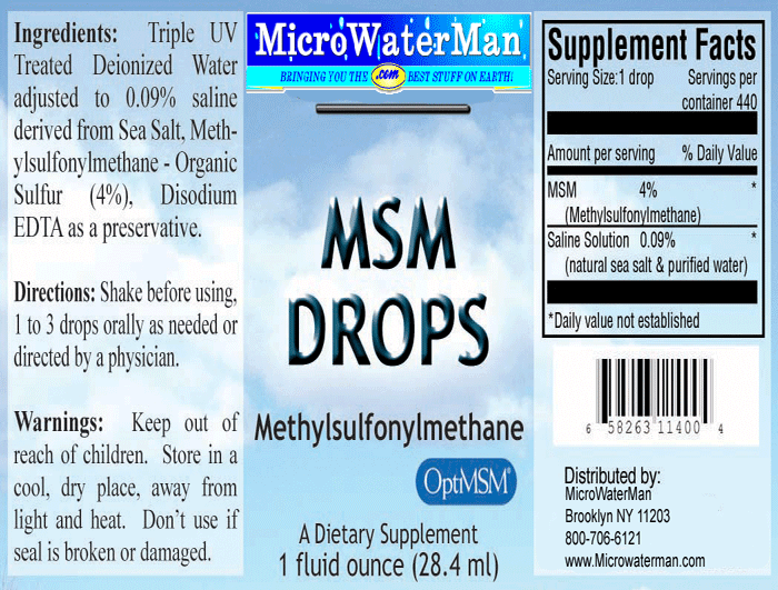 (Methylsylfonylmethane) Water MSM Drops are gentle, soothing, lasting, and all natural. MSM Drops soften the membrane permitting fluids to pass through the cells and tissue.