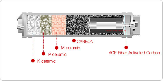 K ceramic: It has plenty of mineral and makes water stable because this ceramic has been baked from the clay fermented by TM.The filters have a 3,600 liter cycle (equivalent to 6 months) by the standard of the passing water quantity of 20 liters a day. Filter change cycles are designed to be displayed by voice guides and LCD icons to be easily known.